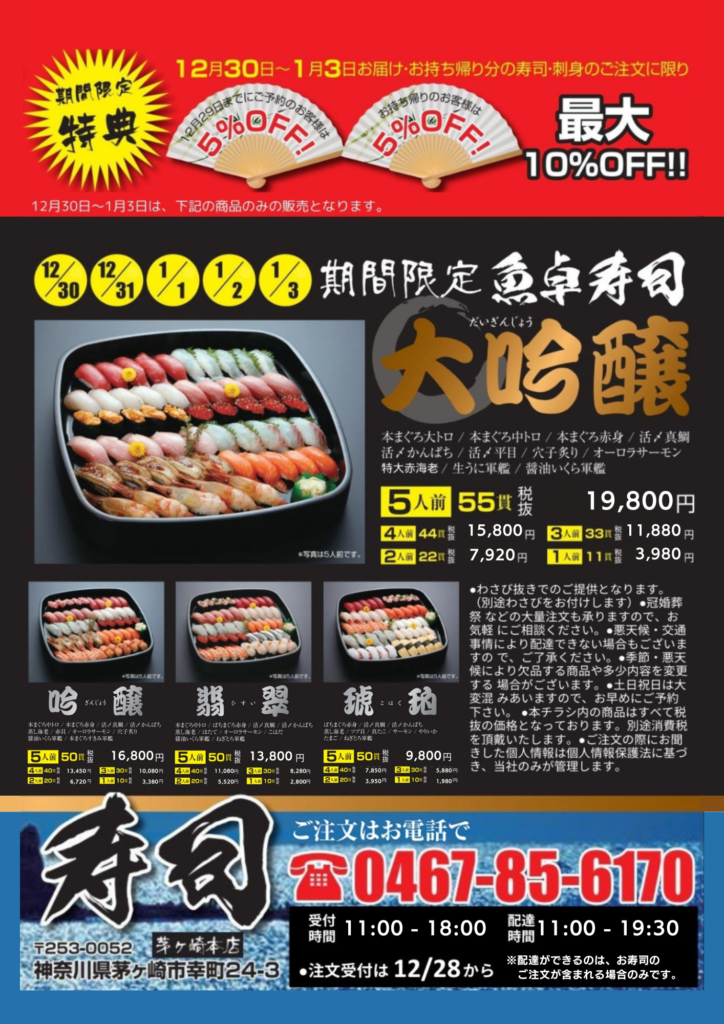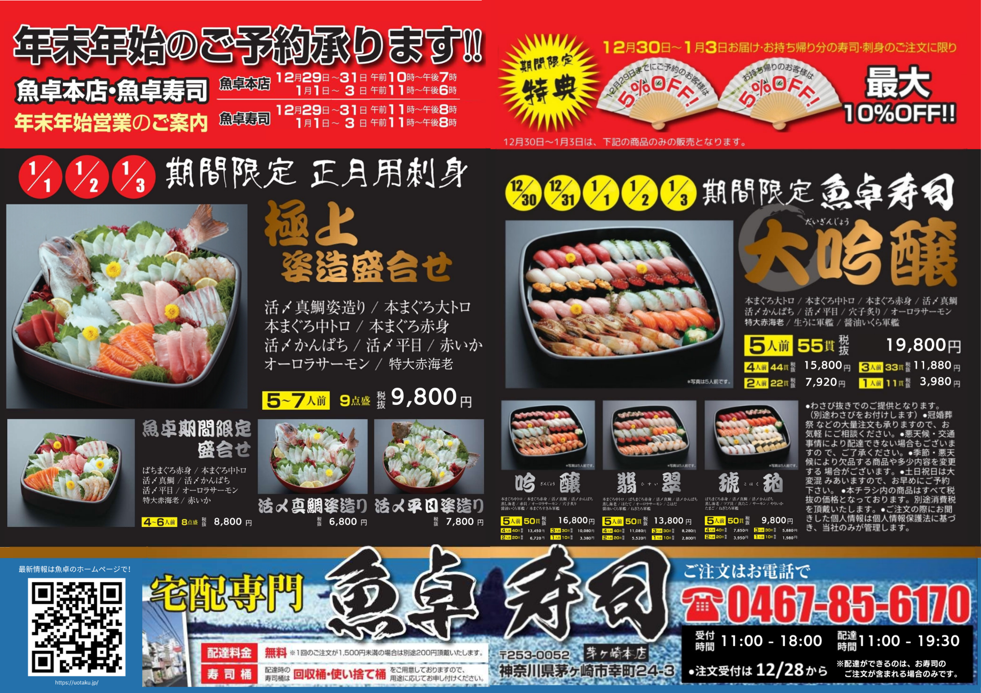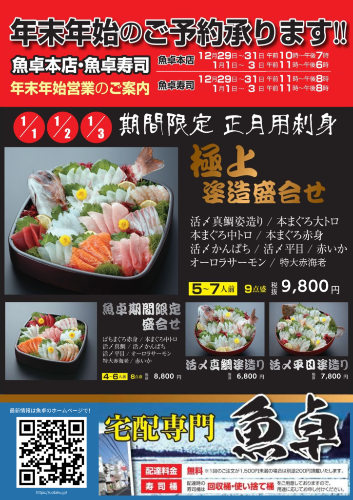 毎年恒例、魚卓の年末年始チラシ情報です。ご注文はお電話( 0467-85-6170 )にて承っています。